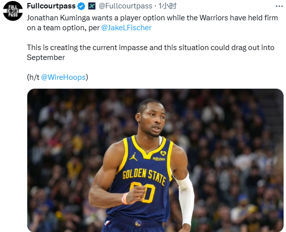 据报道,勇士坚持给库明加1+1球队选项的短期合同,库明加希望新合同中包含球员选项,但勇士坚持保留球队选项,这一分歧导致双方谈判陷入僵局,这种局面可能会持续到九月份,如果这样的话,最终库明加将不得不签下1年790万美元的资质报价,然后明夏成为完全自由球员。