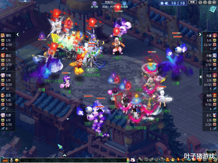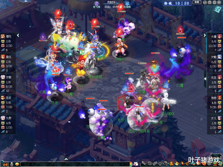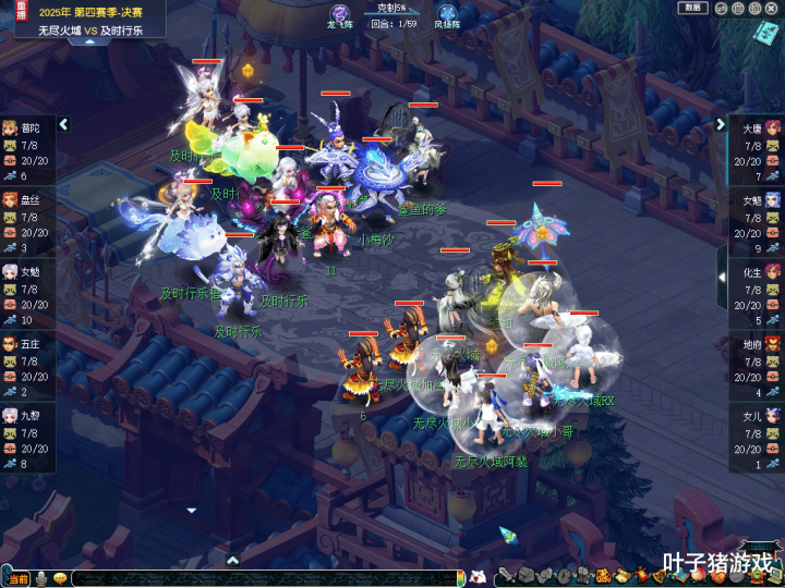 进入比赛后,【无尽火域】选用了“大唐、女魃、化生、地府、女儿”组成的“国标点杀”阵容;【及时行乐】则采用了“普陀、盘丝、女魃、五庄、九黎”组成的“双封面伤”阵容。