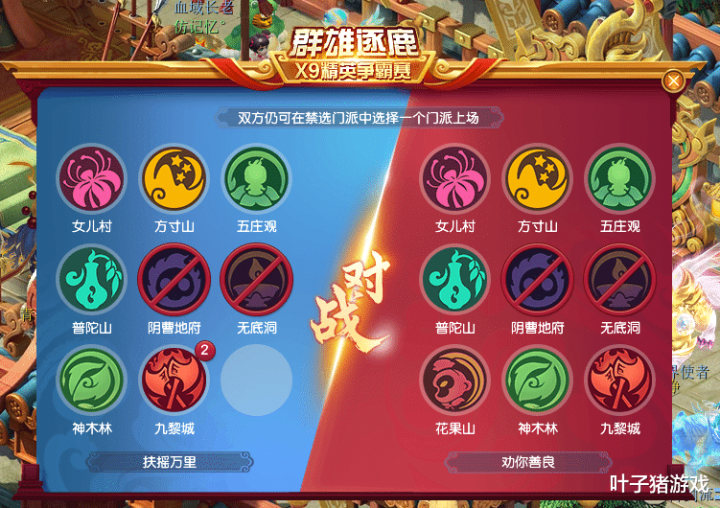 在禁选阶段,【扶摇万里】和【劝你善良】均选择禁用对手地府、无底洞,根据禁选规则,双方可以选择其中一个门派复活。