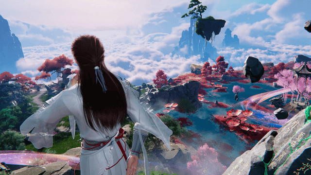 云海中分布着高低错落的浮空岛、恢弘的宗门、各式的灵地秘境,呈现出各具特色的风貌。通过这种立体化的设计,整个画面会显得生动,而不是一望无际的单调云海。
