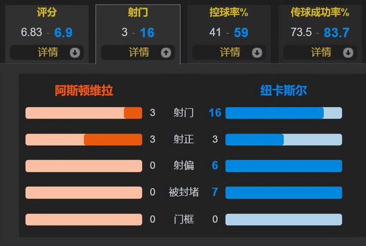 此役正是充分地说明伊萨克对于这支喜鹊军团的重要性。纽卡斯尔场面占优,控球率接近六成(59%),射门次数更是16-3,纽卡斯尔是阿斯顿维拉的5倍多,但双方都是3次射正,这足以说明纽卡斯尔没有伊萨克就好比长矛没有了矛头,看似进攻占优,但捅不死人。如此绝对占优的场面,还接近半小时多打1人,纽卡斯尔就是无法攻破阿斯顿维拉的球门,最终两队是0-0战平。对于阿斯顿维拉而言,少打1人,逼平欧冠级别的球队是满意的。但纽卡斯尔需要好好想下没有伊萨克球队该怎么办,强扭的瓜不甜,戈登踢不了9号位,喜鹊军团抓紧签下一位真正的中锋吧!
