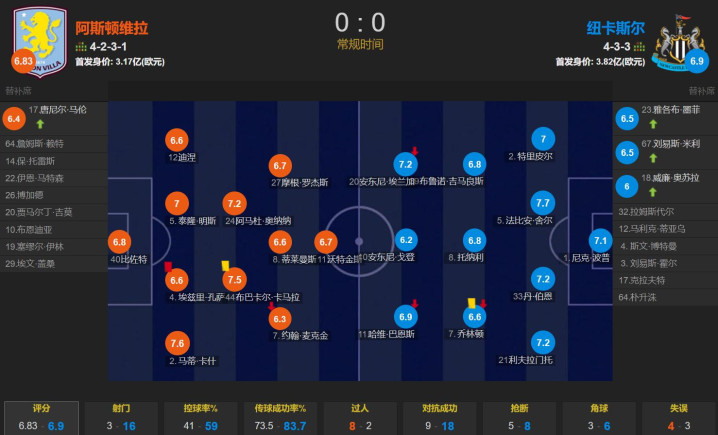 最终,10人阿斯顿维拉0-0纽卡斯尔,两队各取一分,均无缘开门红。