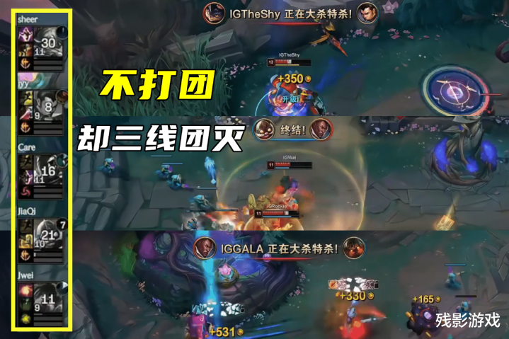双方的第二局,这一局Theshy兰博在被Wei帮忙gank一波之后直接起飞,全场打出了4次单杀。在遭到FPX两人越塔gank之时,更是左右扭动,躲掉了艾克和赵信好几个技能,帅气打出了1V2双杀。与此同时,中路的双人组也是开始了对拼,最终拼了个2换2。下路的Wei和配合Rookie进行了越塔,将sheer顺势收下。就这样,IG打出了又一个名场面,都没打团,却三线打出击杀,给FPX打了个团灭。