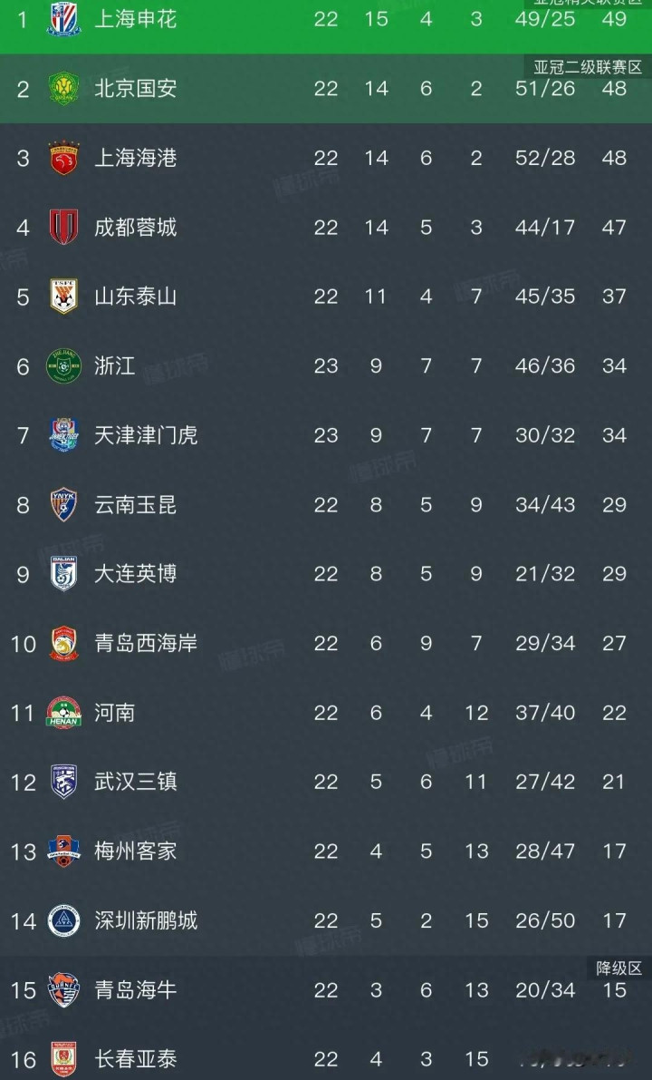 积分榜前4名上海申花、北京国安、上海海港、成都蓉城分别积49~47分,仅相差两个积分,只要一场失利就可能从榜首跌至第4,这在中国顶级足球联赛史上绝无仅有,2025赛季的争冠真正实现了群雄逐鹿,四队争冠的现象也许会一直延续到中超最后一轮。