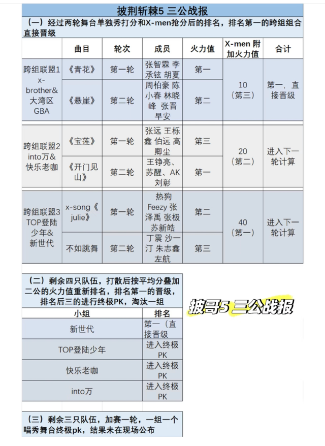从传出的消息上看,在上半场比赛中,李承铉、张智霖、胡夏带来的《青花》获得第一名,在下半场比赛中,苏醒、王铮亮、刘彰带来的《开门见山》获得第一名,在正常情况下,会通过算总成绩,然后选择淘汰,但第三轮舞台公演增加“红牌PK”。