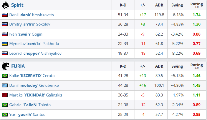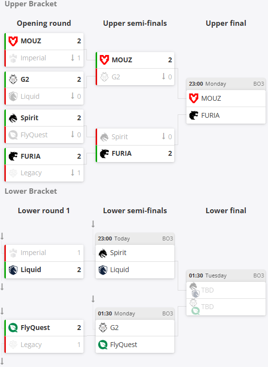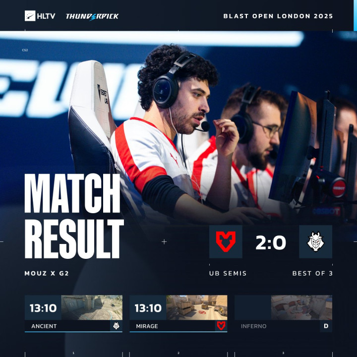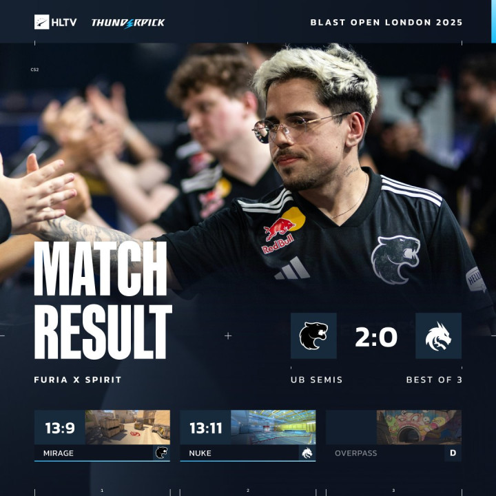 虎扑08月31日讯BLAST伦敦公开赛线上小组赛阶段第四日B组赛果:胜者组方面,MOUZ两图13-10险胜拒绝G2翻盘、FURIA爆冷横扫Spirit,两队会师胜者组决赛并携手挺进线下淘汰赛阶段。