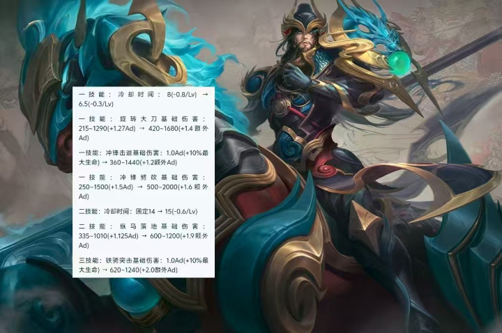 前面提到,关羽可能会和宗师之力高度绑定,原因就是关羽的冲锋普攻从原来的不可暴击修改为可以暴击,而且关羽所有技能的基础伤害都有所加强,原有的AD伤害加成也变成为了额外AD伤害加成,那么关羽出暴击装备的空间就变大了不少。