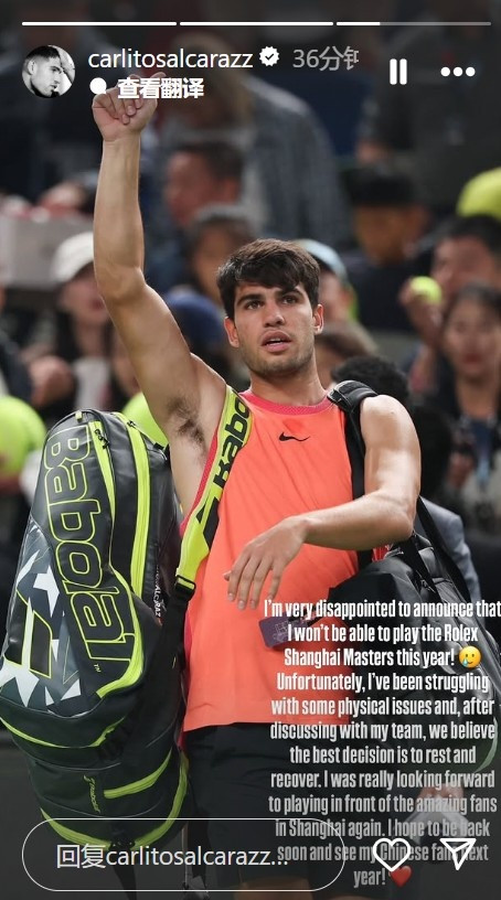 阿尔卡拉斯写道:“我非常遗憾地宣布:我今年将无法参加罗杰斯上海大师赛!”