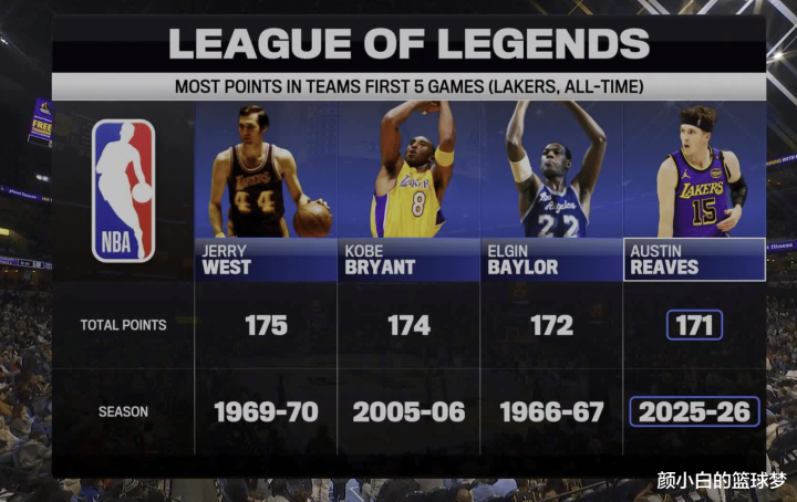 随着卢卡-东契奇的复出奥斯汀-里夫斯的球权占有率、出手率都会下滑,首节5中2,三分2中0,罚球3中3,拿到7分1篮板1助攻1抢断,东契奇首节是13分。官方给到里夫斯前五场比赛171分湖人队史第四,仅次于韦斯特、科比、贝勒。