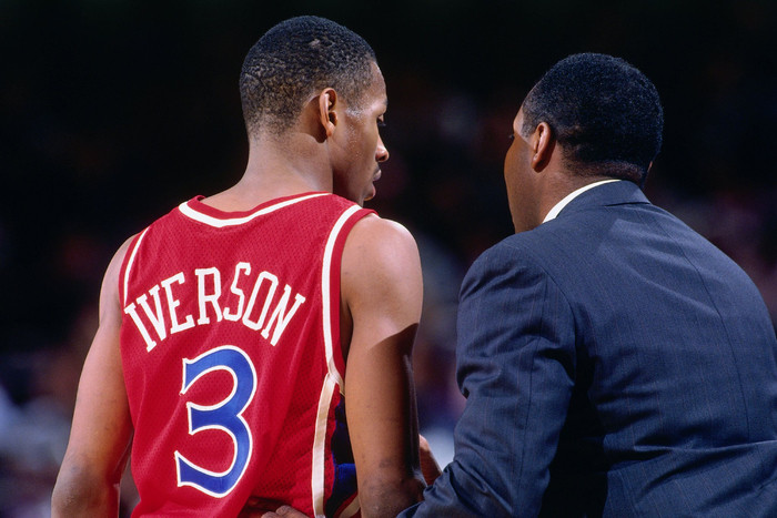当时联盟的进攻风格与现在天差地别——那仍属于内线的末法时期,比赛节奏普遍缓慢而沉闷,进攻大多要围绕大个子球员展开。1990年选秀的状元秀德里克-科尔曼是76人半场进攻的核心,只要他在场,球队就会尽量将球交到低位由他发起。而斯塔克豪斯作为球队上个赛季的头号得分手,同样需要在侧翼和低位获得进攻机会。贵为状元,艾弗森也不得不先学会给老大哥们“打下手”,常常需要等待队友落位,再伺机传球。