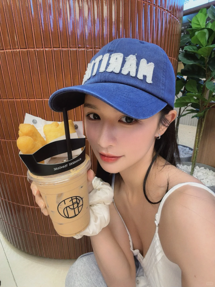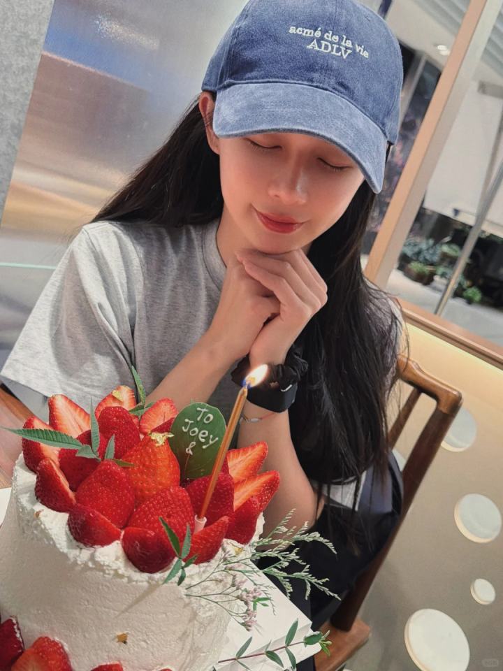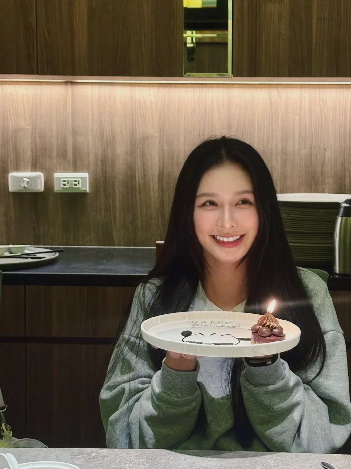 曝光照片中,只见“寿星女”身穿米灰色短袖T恤、头戴浅蓝棒球帽,双手握拳托腮,微闭双眼,肤白貌美、清纯可人,满是少女娇俏感,丝毫不像是30+的年龄。