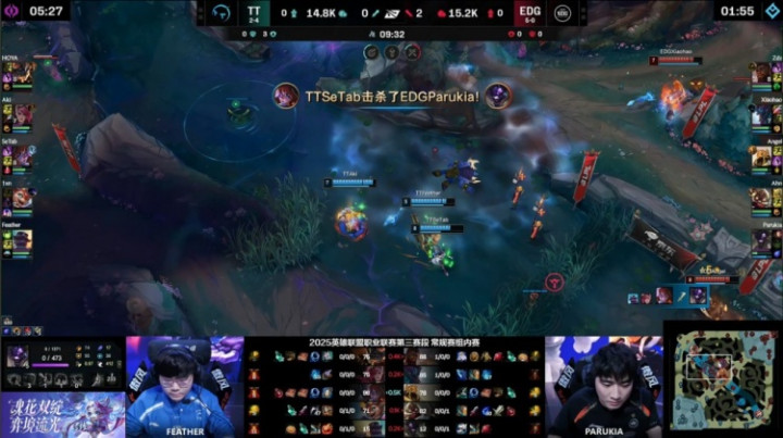 [9:36]巢虫团,Parukia牛头被Aki蔚锁头,Feather布隆与SeTab阿萝拉到场,TT三人将其击杀,双方经济持平,TT拿到三条巢虫。