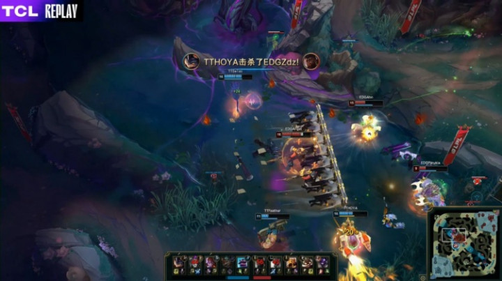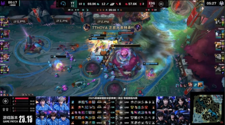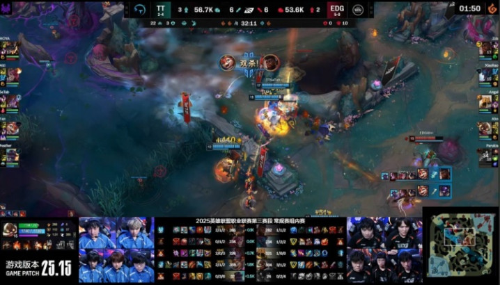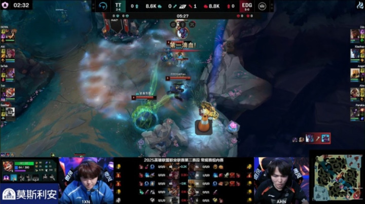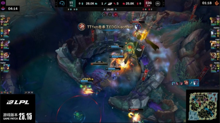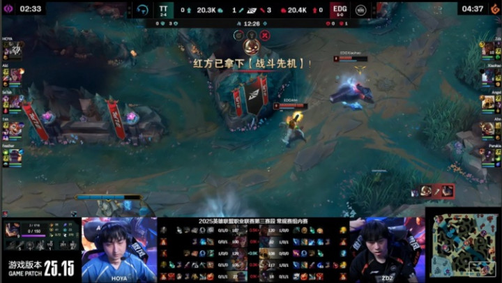 [23:03]EDG来开小龙,TT三人C字草打掉zdz奎桑提半血,EDG五人只能撤退,TT拿到小龙,随后TT再开厄塔汗,EDG多人残血接团,双方拉开,TT经济领先2k,本局为火龙魂。