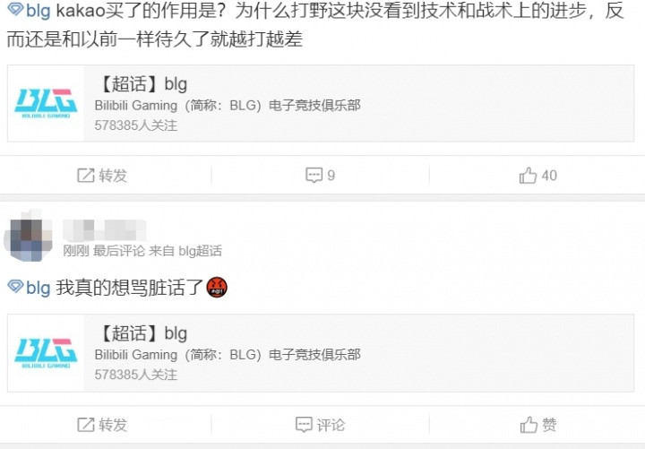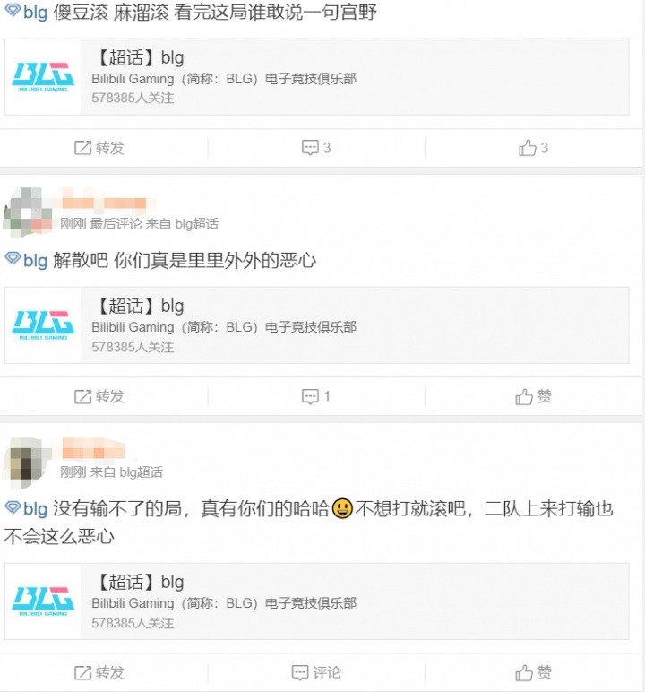 猎杀时刻! 超话热议BLG首局不敌iG: Shad0w赶紧滚! AD和辅助最近有够菜的 直播吧8月18日讯今日LPL第三赛段BLG首局不敌iG,而在大优势领先的情况下惨遭iG翻盘引起了粉丝们的强烈不满在赛后涌入官博发泄情绪。