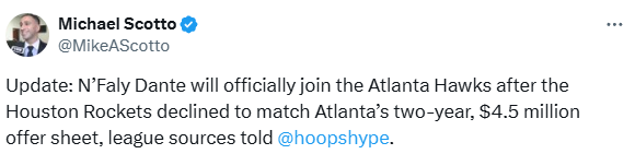 火箭拒绝匹配报价,因此当特将正式加盟老鹰,随后老鹰官宣签下当特,并且晒海报欢迎当特来到亚特兰大;当特成为NBA历史第一位以双向受限制自由球员的身份签下正式合同的球员。
