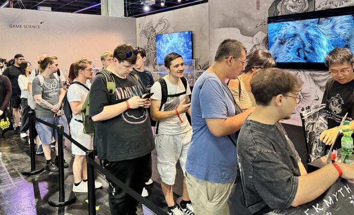 在展会现场,有电视厂商支起两台百吋巨幕,把游戏里的崇山峻岭、殿宇楼阁带到了全球玩家眼前,每一帧画面都看得人热血沸腾。同时,隔壁《影之刃零》展区同样热闹,这款备受关注的国产新作试玩区里,更是直接摆了10台大屏电视,让老外们排队体验武侠世界的刀光剑影。
