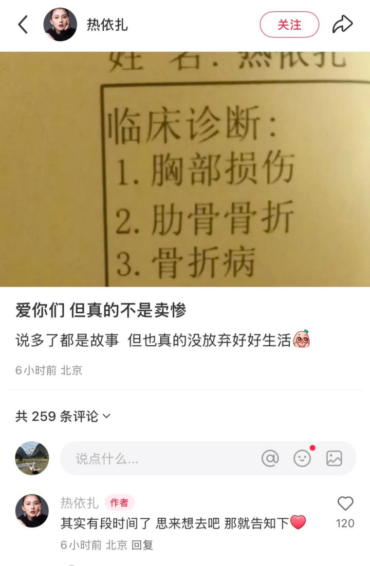热依扎晒出了自己曾经的病情诊断结果,不仅有胸部损伤,还有肋骨骨折、骨折病等,单看文字叙述,网友都感觉胸口疼痛。