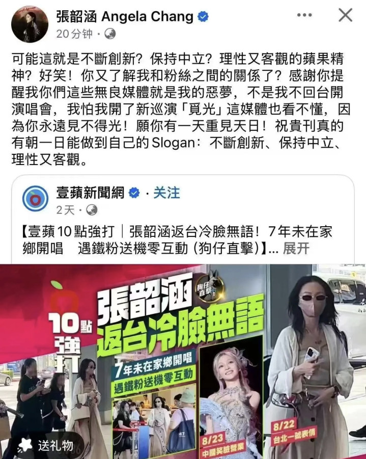 2025年8月28日,华语乐坛“小天后”张韶涵因一条社交平台发文冲上热搜。起因是台媒《壹蘋新聞網》26日发布报道,标题直接“上强度”——《张韶涵返台冷臉無語!7年未在家鄉開唱遇鐵粉送機零互動》。