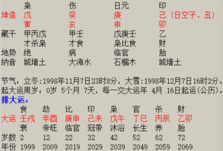 现在行的是庚申大运(2019年至2028年),地支寅申冲,又坏了寅木,这步运能好就怪了。应该是2019年己亥年或2022年壬寅年就有问题了。
