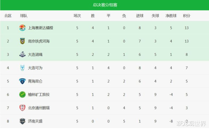 (注:中冠总决赛A组积分榜上,大连涵瑀积8分,排名北区第三,大连可为积7分,排名北区第四。)