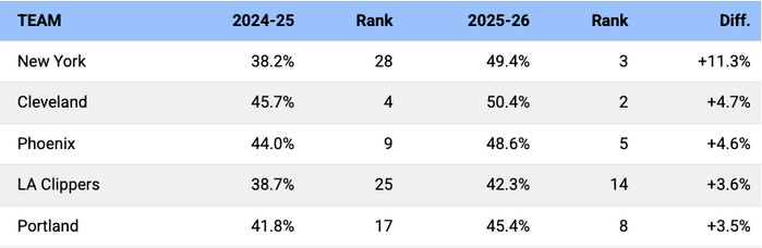 本赛季,全联盟三分出手占比从42.1%降至41.7%,30支球队中有16支出现下降。而在新帅迈克-布朗麾下,尼克斯队的涨幅断层领先联盟……