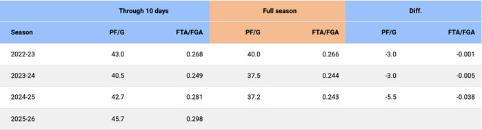 罚球是最高效的得分方式,而本赛季罚球次数显著增加。场均45.7次犯规是过去30年来的最高值,较上赛季的37.2次上涨23%。