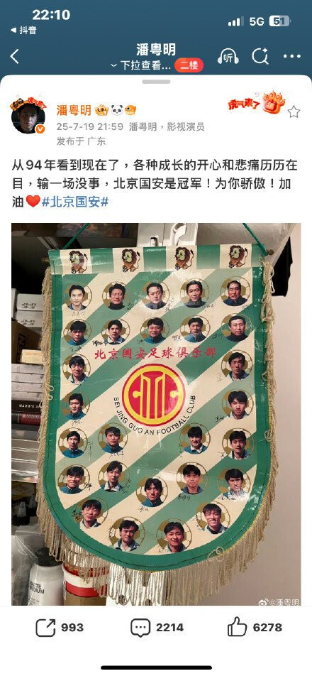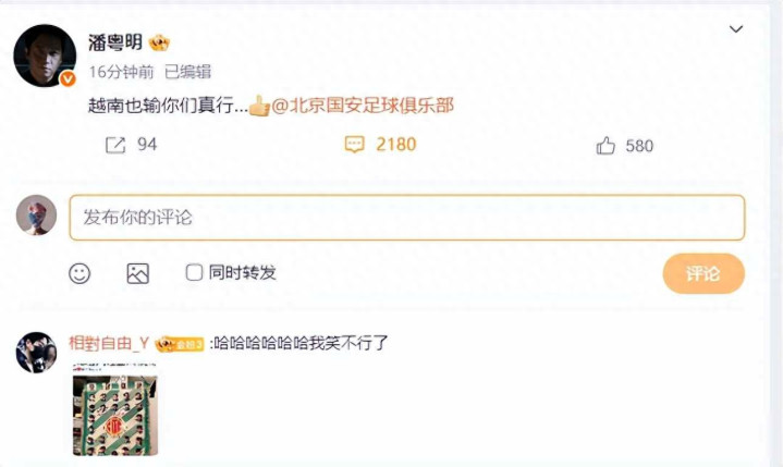 潘粤明在比赛结束后三个小时内发了条微博,他说越南也输你们真行,他先是@了北京国安账号,过了十五分钟又改成@北京国安俱乐部,这人从1994年就开始看国安队的比赛,对这支球队感情很深,之前还说过输一场没关系国安能拿冠军,这次发火不是突然生气,是真的觉得撑不下去了。