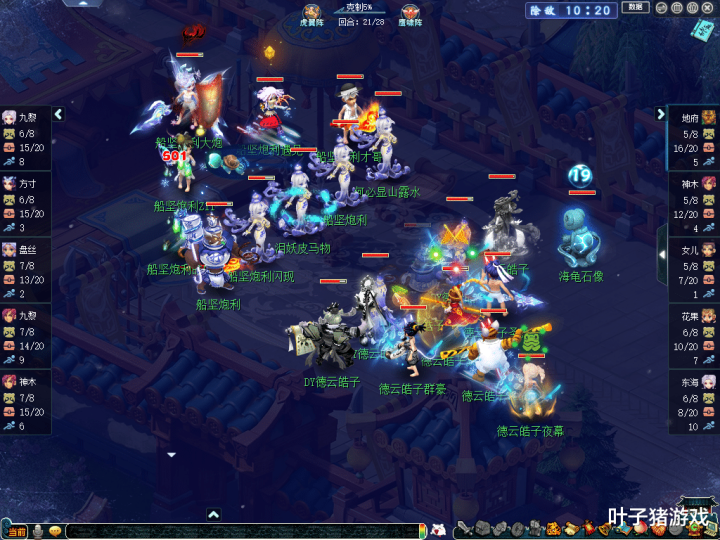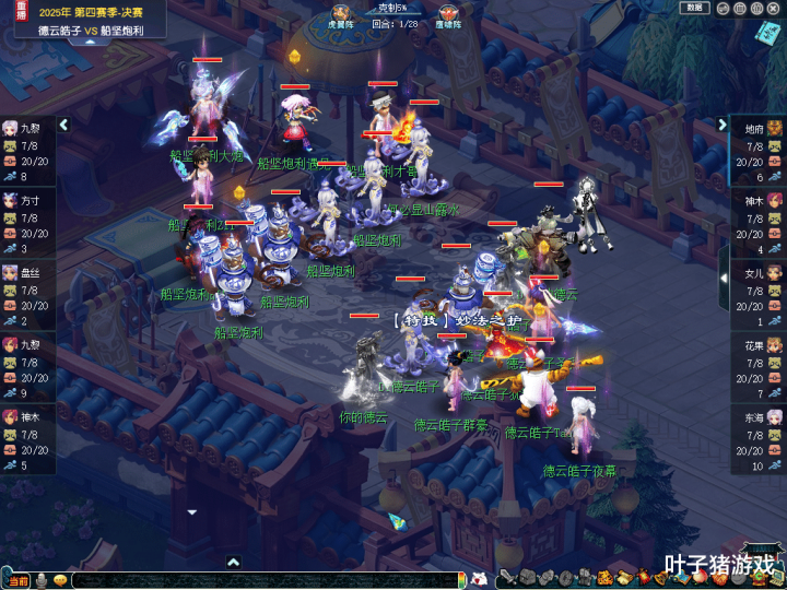 进入比赛后,【德云皓子】选用了“地府、辅助神木、女儿、花果、东海”组成的“双辅点杀”阵容;【船坚炮利】则采用了“九黎、方寸、盘丝、九黎、辅助神木”组成的“双封面伤”阵容。
