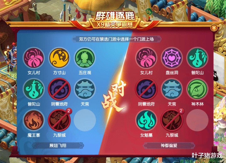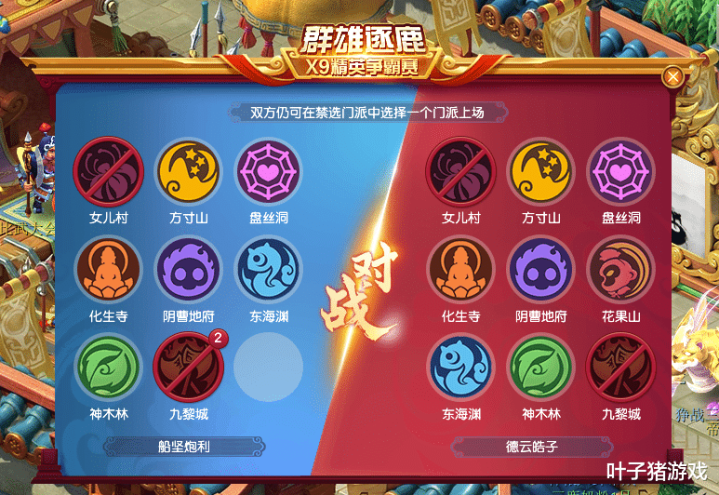 在禁选阶段,【船坚炮利】和【德云皓子】均选择禁用对手女儿村、九黎城,根据禁选规则,双方可以选择一个门派复活。不过,单就阵容选择面来说,携带双物理的【德云皓子】有一定有优势。