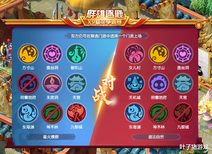 在禁选阶段,【星火燎原】被禁地府、神木,【道法自然】被禁神木、九黎。根据禁选规则,双方可以选择一个门派复活。