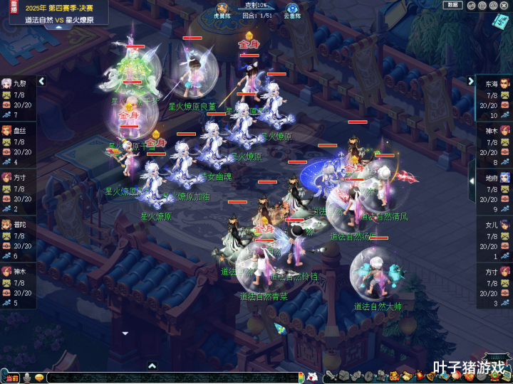进入比赛后,【道法自然】选用了“东海、辅助神木、地府、女儿、方寸”组成的“四保一”阵容;【星火燎原】则采用了“九黎、盘丝、方寸、普陀、辅助神木”组成的“四保一点杀”阵容。