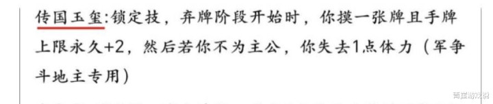 传国玉玺:锁定技,弃牌阶段开始时,你摸一张牌且手牌上限永久+2,然后若你不为主公,你失去1点体力(军争斗地主专用)