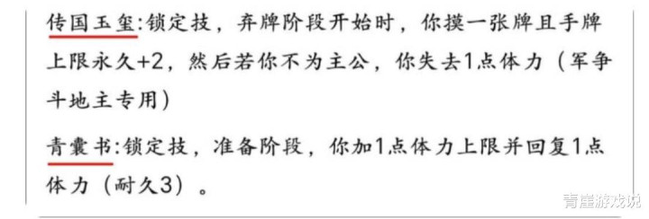 这件宝物有点类似杨彪技能,都是在准备阶段时增加体力上限并回复体力。不同的是青囊书后期不需要扣减体力,加多少血就是多少血,完完全全没有负面效果!耐久3的意思是只能发动三个回合,但是这是宝物牌,暂时还不知道耐久值能不能抵消拆卸次数……