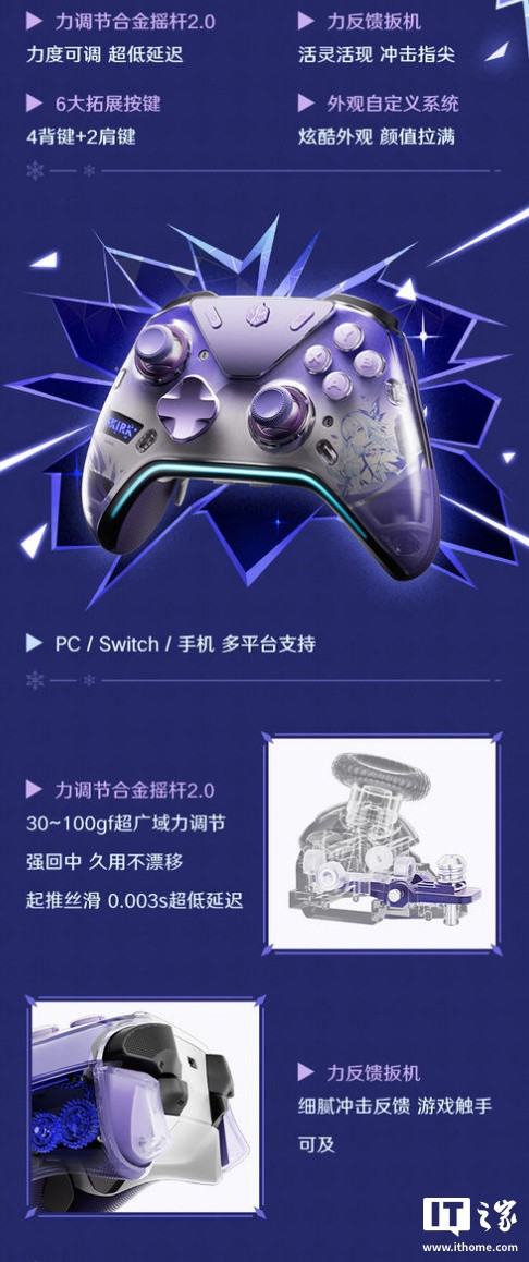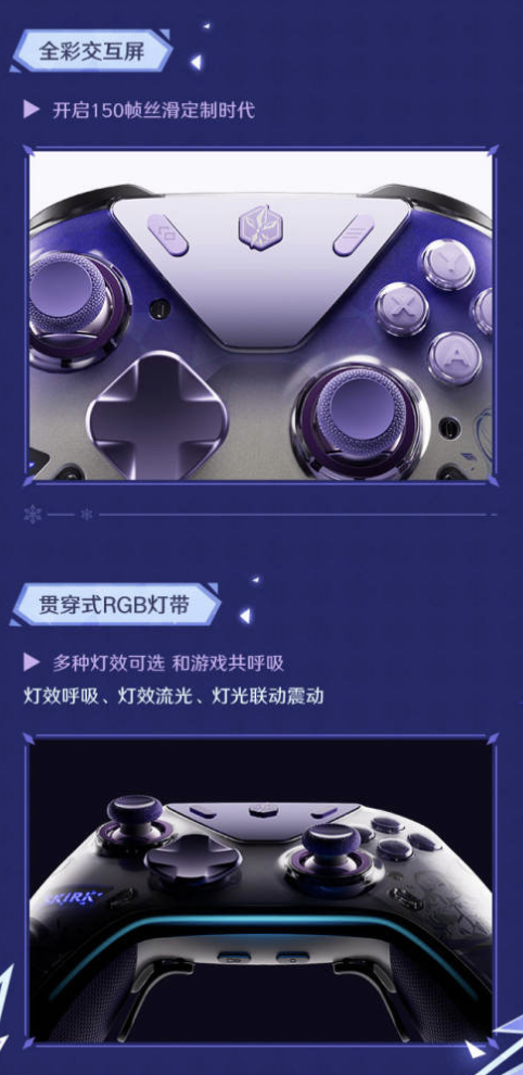 外观方面,IT之家注意到这款手柄使用“丝柯克”印象色,左侧握把镶嵌可替换灯牌,右侧握把将角色立绘融入设计,其全彩交互屏还支持自定义设置GIF动图,同时配有可选灯效的贯穿式RGB灯带。