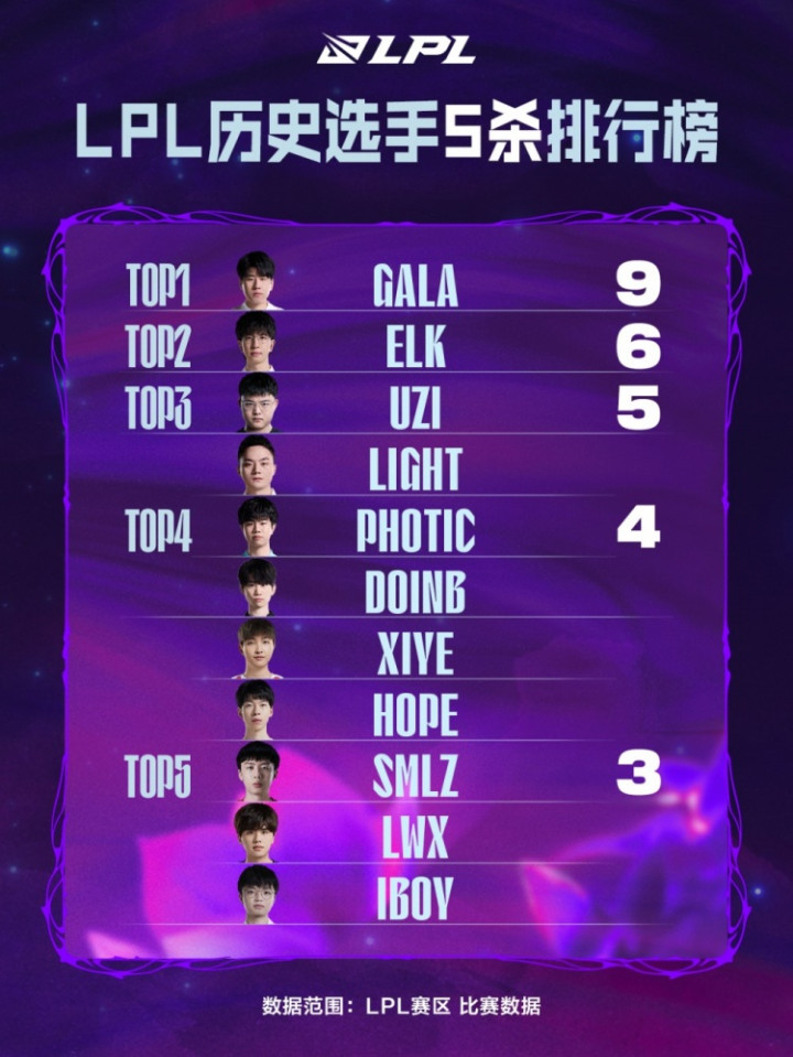 LPL历史五杀排行榜中,GALA选手以9次位列榜首,随后是Elk6次、Uzi5次、Light4次、Photic4次、Doinb4次、xiye3次、Hope3次、Smlz3次、LWX3次、IBoy3次。