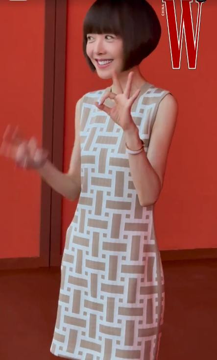 她面对镜头比 V,笑容灿烂,眉眼弯弯,可爱又俏皮,完全看不出 55 岁的年龄。