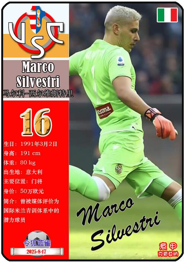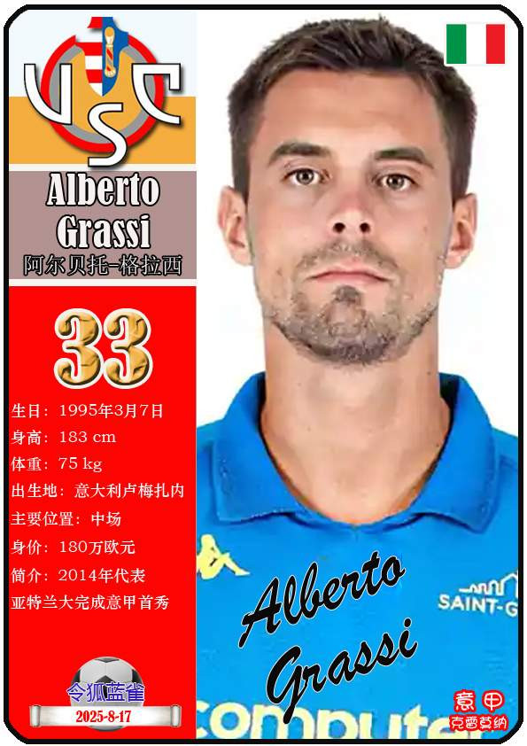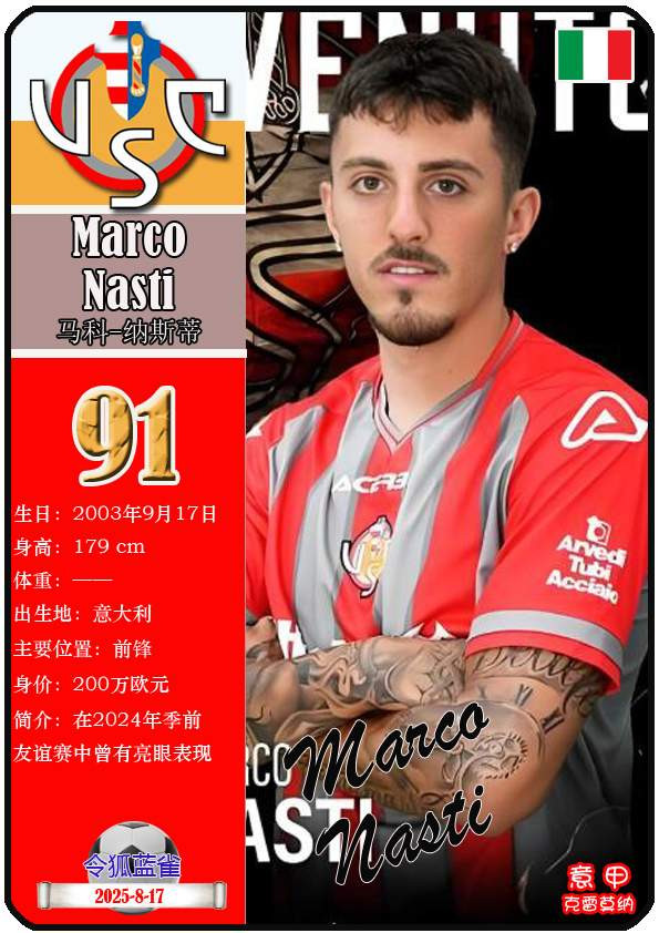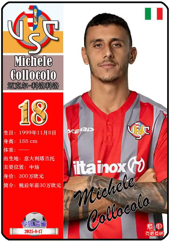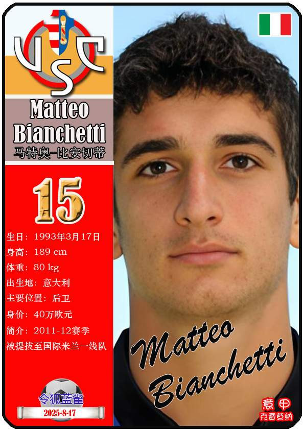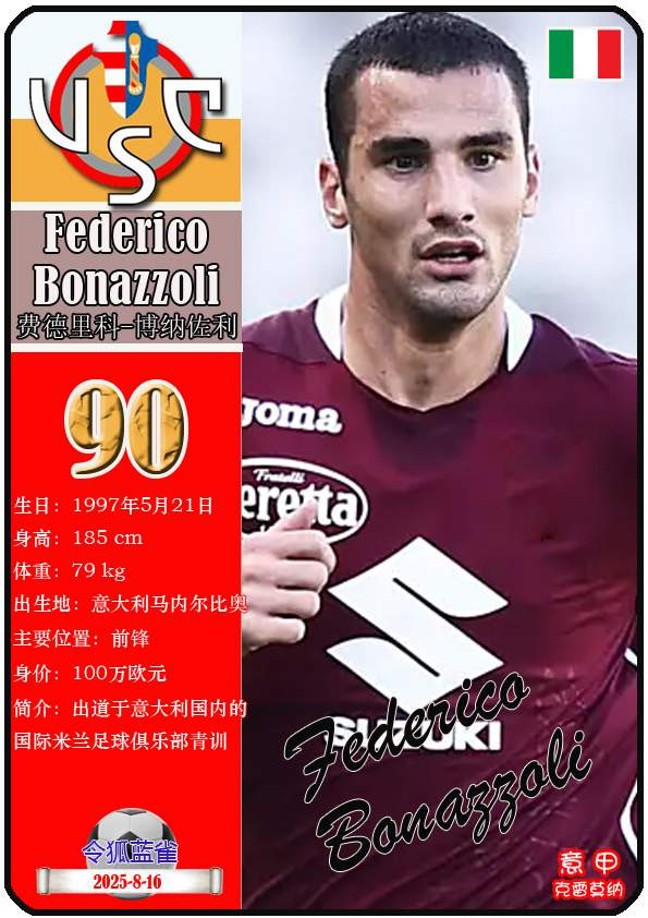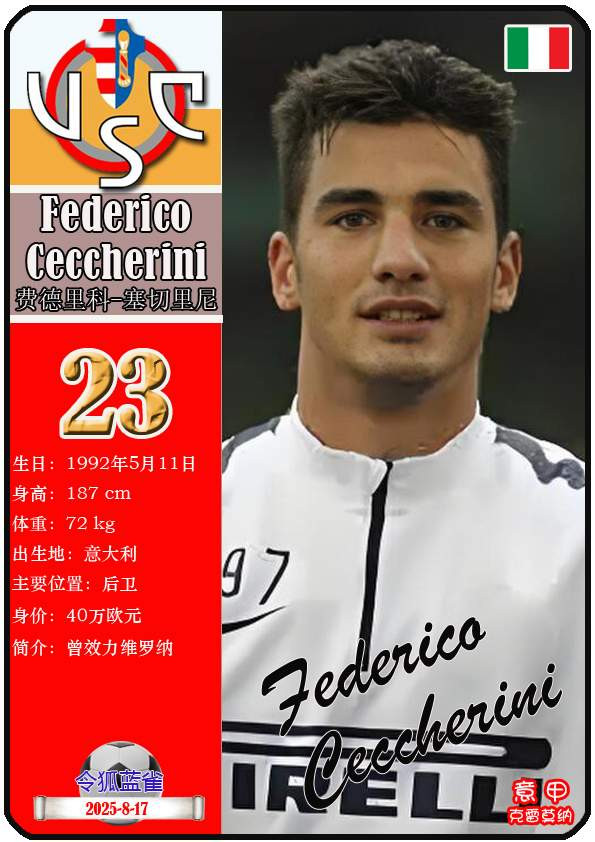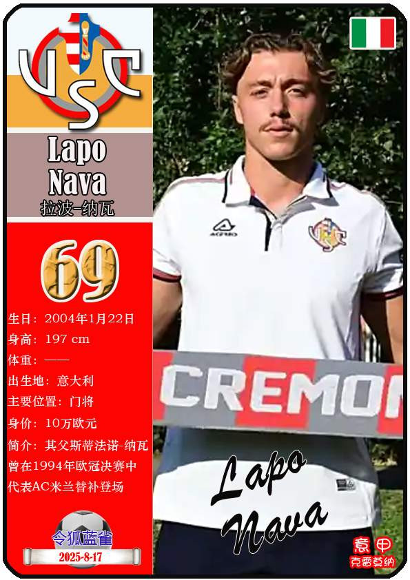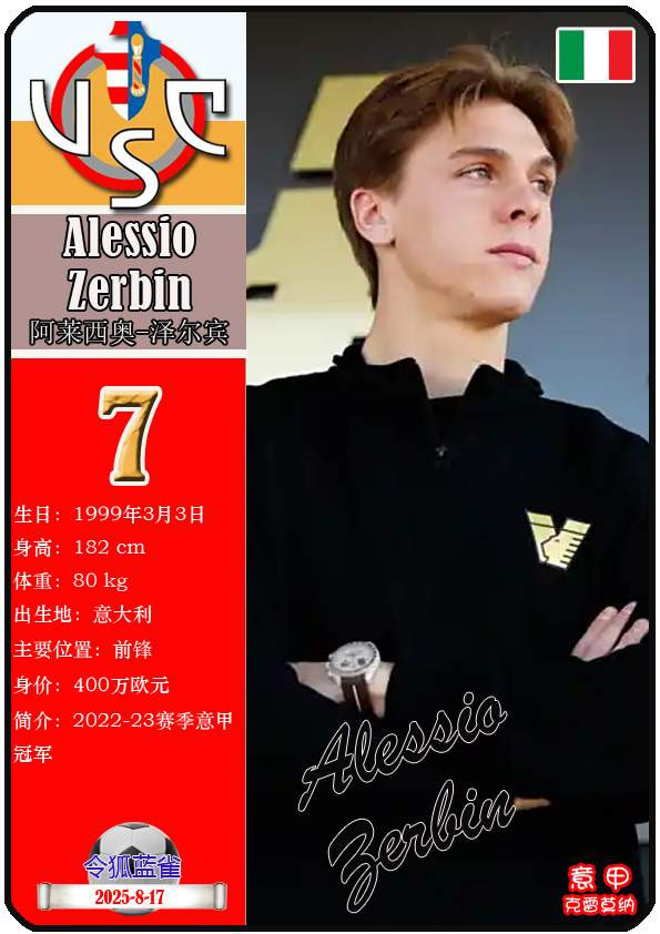 意甲克雷莫纳足球俱乐部成立于1903年3月24日,是本赛季意甲升班马。截至2025年8月17日,球队主教练是大卫-尼科拉,队内拥有球员查尔斯-皮克尔、曼努埃尔-德-卢卡、阿莱西奥-泽尔宾、马特奥-比安切蒂、罗马诺-弗洛里亚尼-墨索里尼等。本期以球星卡的形式展示目前意甲克雷莫纳足球俱乐部的20名球员(按球衣号码排序):