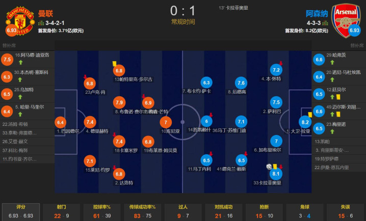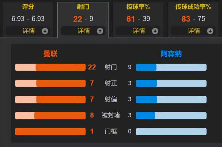 全场比赛,曼联的控球率为61%,一共有22次射门,其中7次射正;阿森纳有9次射门,其中3次射正。