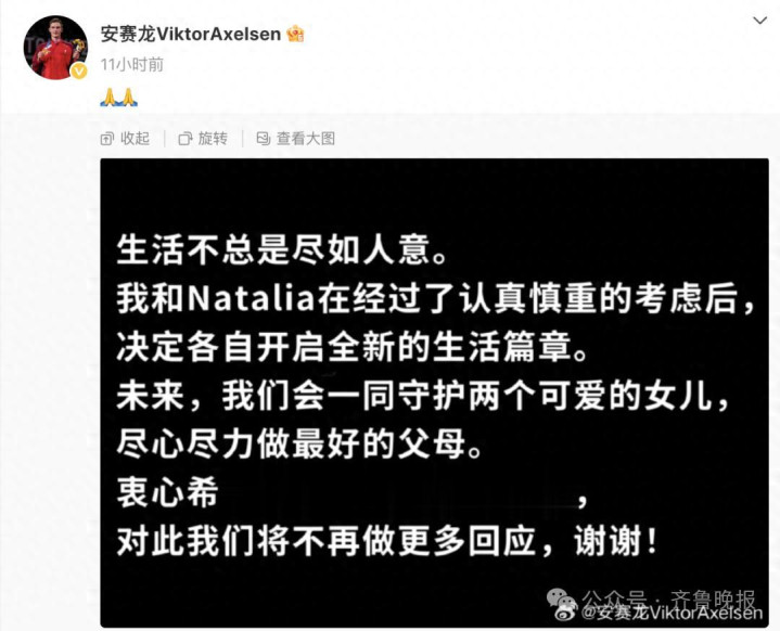8月19日晚,两届奥运会冠军、丹麦羽毛球运动员安赛龙(Viktor Axelsen)更新社媒,宣布与未婚妻纳塔利娅(Natalia)分手,两人将共同守护两个女儿。