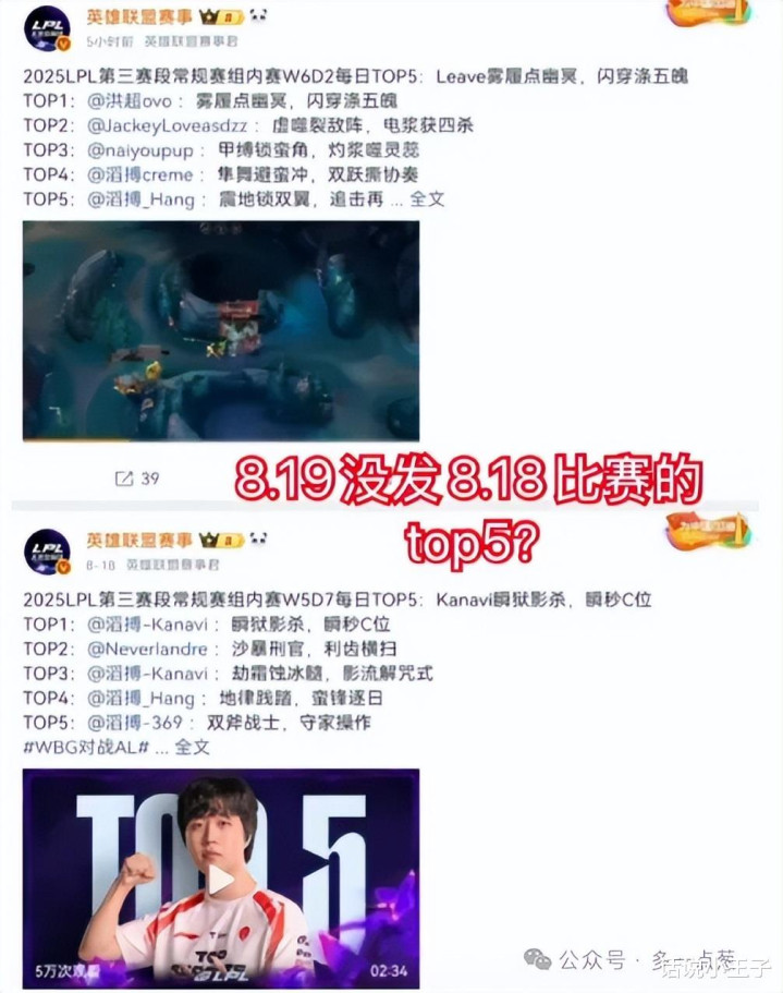 大家都知道IG和BLG的这场比赛都已经过去好几天了,大家知道现在还有很多粉丝在讨论这场比赛,说明这场比赛所产生的后劲真的是很大。按照惯例,在每日比赛结束之后,官方都会在第2天发布TOP5,然而这场比赛结束了好几天,官方也没有发布TOP5,这点就被很多粉丝发现不对劲。随着这件事情被发现之后,官方也是火速进行道歉,并且随后补发了IG和BLG的这场Top5。