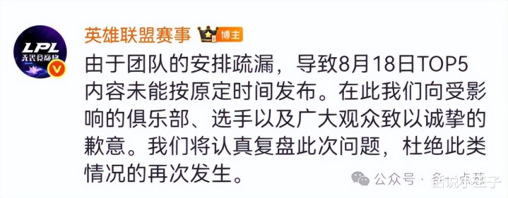 官方给出的理由就是团队的安排疏忽,导致未能在原定时间发布,也就是说他们可能确实是忘记发了。所以官方向受影响的俱乐部以及选手和广大粉丝致歉,同时强调会认真复盘此次问题,杜绝此类情况再次发生。不管是不是真的忘记发还是出于什么原因,最后还是发了,只是没有想到官方也能犯这种低级失误,这背后的工作人员肯定要扣绩效了,毕竟这场比赛的影响实在是太大了。