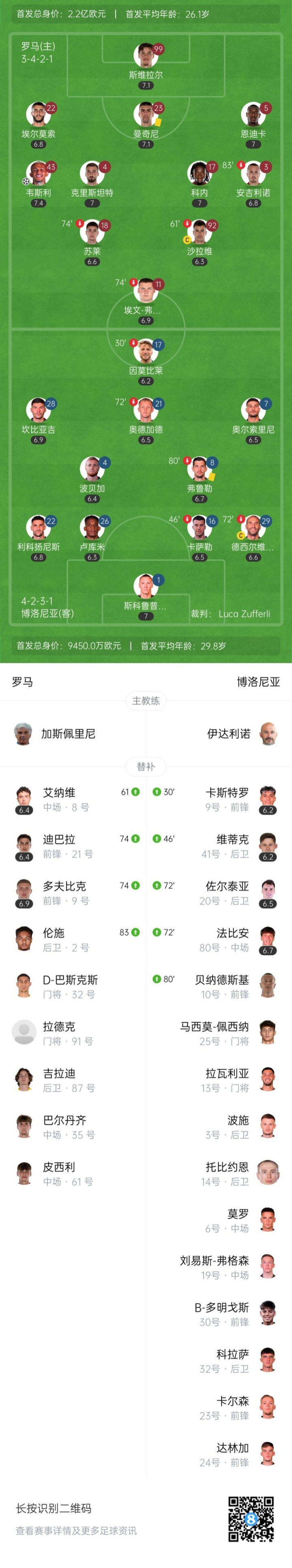 第53分钟,韦斯利右路接长传停大了,但对手失误,皮球误打误撞再次来到韦斯利脚下!韦斯利禁区内右侧破门建功!罗马1-0领先博洛尼亚↓