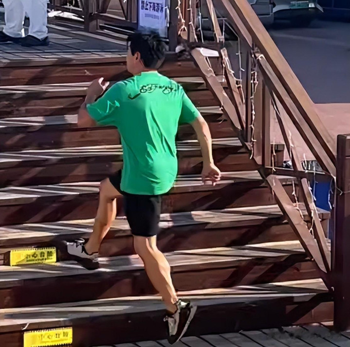 在前阵子看他的时候,和别人打了招呼之后,立刻小跑着上台阶。
