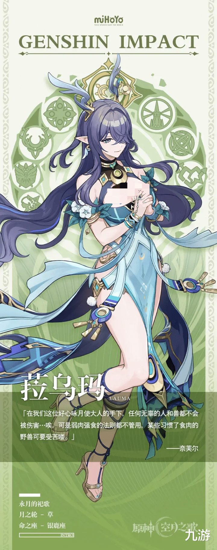 第二期卡池的新角色是充满了圣洁气息的菈乌玛,整体形象设计以淡蓝色为主,看上去让人的视觉感觉很舒服,她是霜月之子的咏夜使,负责遵循最初圣女留下的神谕,坚持善念与信仰;在演示当中,已经展现了她能变身为白鹿,作为6.0的第一个草系角色,机制大概率是月草新反应,还是比较值得期待的。