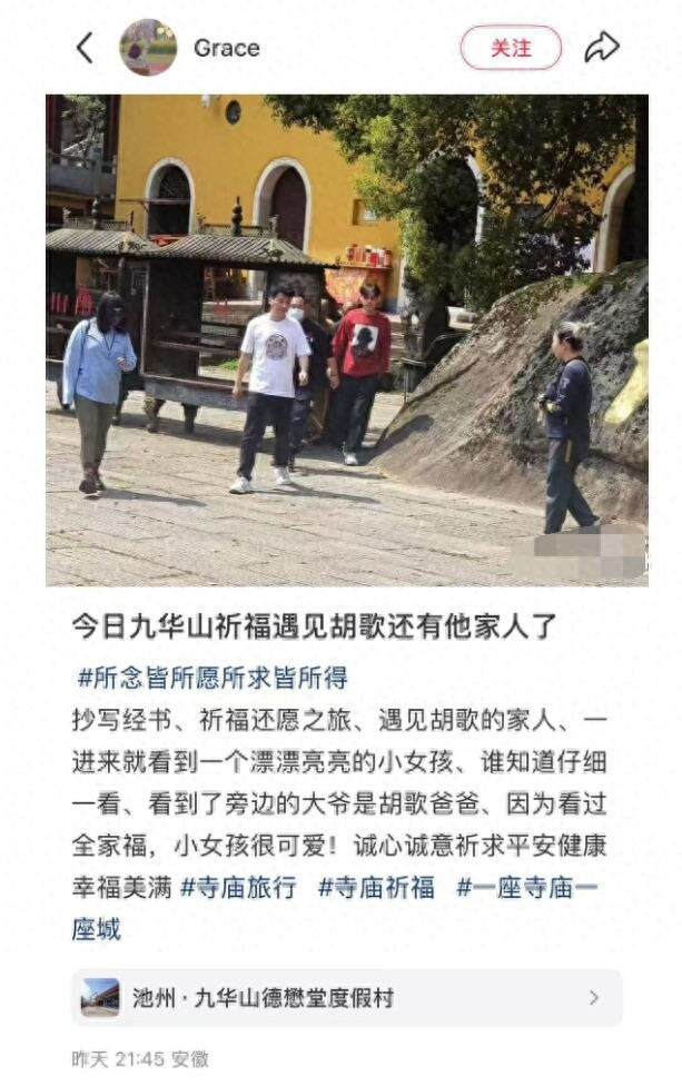 胡歌此前还与家人去九华山祈福,据悉,当时女儿也在,有偶遇的网友透露称,小女孩漂漂亮亮的很是可爱,胡歌的巴阿也在,但是,当时黄曦宁并未现身。
