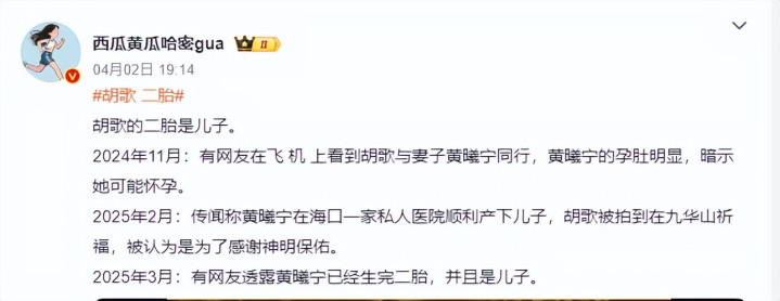 当时就有传闻称胡歌是去九华山还愿黄曦宁生下二子,但真假不知。无论如何,祝福胡歌一家永远幸福。