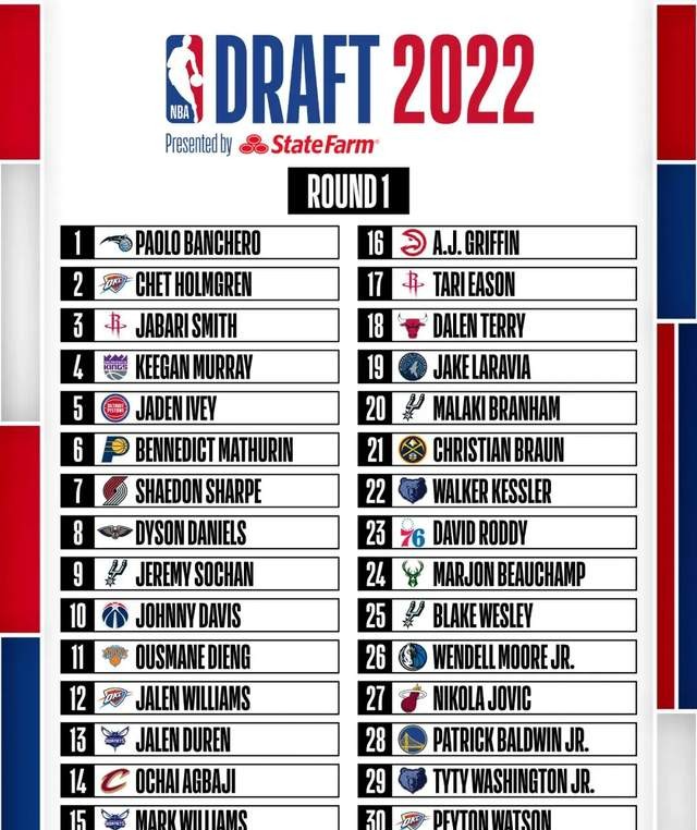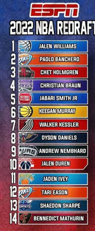 ESPN根据这几年的整体实力表现,各支球队会选择更优秀的球员,2022年选秀大会前14顺位具体如下: