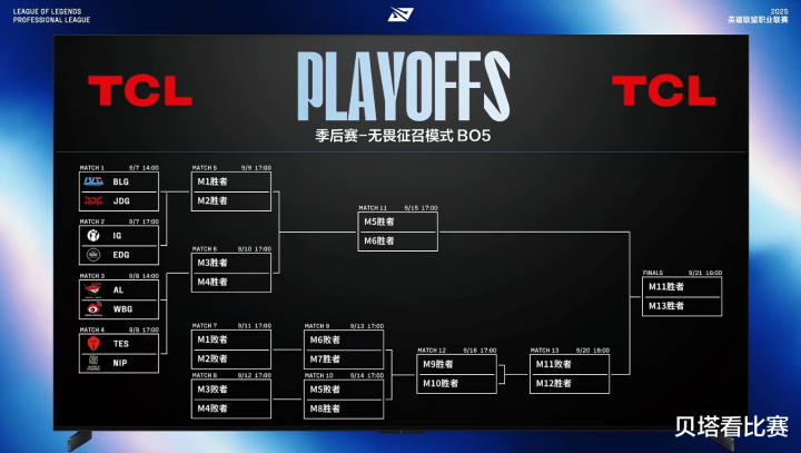 最后就是赛程安排如下,9月7日14点BLG大战JDG,17点IG对阵EDG;9月8日14点AL大战WBG,下午17点TES大战NIP,一天两个BO5,赛程安排得还是比较紧的。
