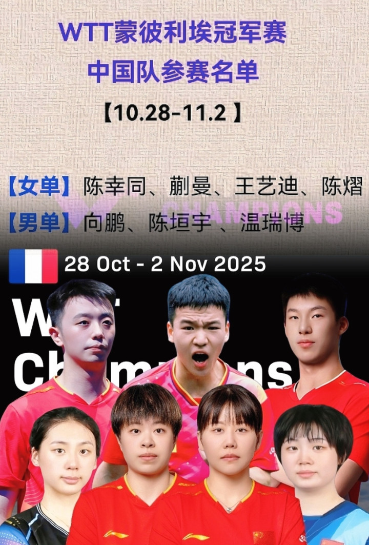 如今,国乒蒙彼利埃冠军赛参赛阵容还有7人,具体如下——