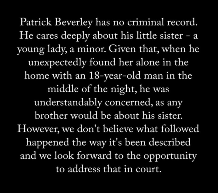 贝弗利更新社媒(疑似不是本人所写),解释了相关情况,他写道:“帕特里克·贝弗利没有犯罪记录。他非常关心她的小妹妹——一个年轻女孩子,还是未成年。考虑到这一点,当他半夜意外发现她和另一个18岁的男人单独在家里时,他的担心是可以理解的,就像任何一个哥哥对妹妹的担心一样。然而,我们相信,接下来发生的事情并不像描述的那样,我们期待在法庭上解决这个问题的机会。”